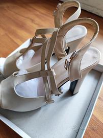 Sandali con cinturini regolabili. Aperti. Color bianco panna. Taglia 40. Tacco 12cm con un po' di zeppa di 2,5 cm. Indossati una sola volta. In ottimo stato.
