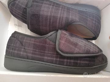 Ciabatta uomo invernale ortopedica uomo. Tutta apribile e regolabile con velcro, chiusa posteriormente. Tessuto in tartan; Altezza in pianta: 1,5 cm; Altezza tacco: 3 cm; Numero 41