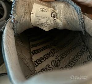 Vendo scarpe Saucony Jazz sneackers blu e argento, taglia 40, con segni di usura soprattutto sulla suola e una parte macchiata visibile come da foto.