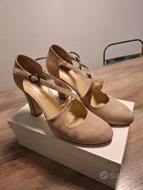 Vendo paio di scarpe scamosciate beige, con cinturini incrociati, indossate pochissimo. Adatte anche come scarpe da ballo. Misura 40. Altezza tacco 10 cm.