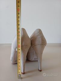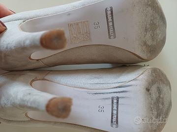 Usate 2 o 3 volte. Punta aperta, scamosciate color panna. Numero 35.