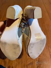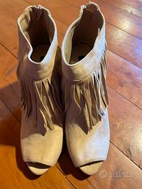 Scarpe come nuove, (come si può vedere dalle foto) indossate solo ed esclusivamente una volta per provarle, vendo per inutilizzo, altezza del tacco 9,5 cm. Colore beige, con frange, scamosciate, con retina come si può vedere nelle foto, scarpe adatte in primavera estate e anche inizio autunno.molto particolare edesclusive. Numero 39.