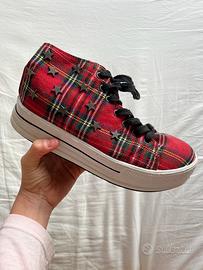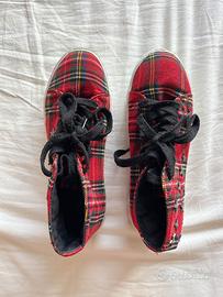 Scarpe a fantasia scozzese con quadri rossi e neri, lacci neri spessi e stelline borchiate ai lati