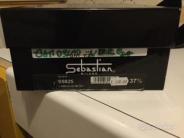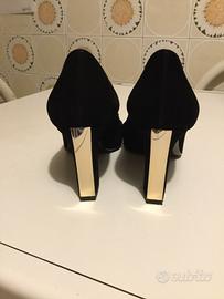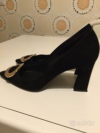 Scarpe Sebastian Milano Originali décolleté nere in camoscio con fibbia dorata. Anche nella parte posteriore del tacco, ritroviamo una striscia dorata. Numero 37,5 e tacco 8cm