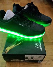 Scarpe da ginnastica Shinmax nr. 40 colore nero, dalle suole con luci a led colorati, che si illuminano di vari colori ad intermittenza, con interruttore . Difettoso il contatto della scarpa sinistra, che non si accende. Ad euro 10,00.