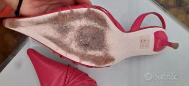Scarpe vintage fucsia sling-back nr. 36/37 con laccetti regolabili made in Spain, marca Sinela. Bellissimo incrocio sul davanti con suola d'appoggio ampia e comoda per camminare, 100% interamente vera pelle. Tacchetti altezza medio-bassa, in ottimo stato. Usate pochissimo, come si può desumere dalla etichetta.