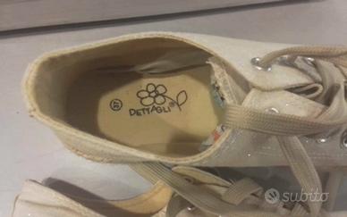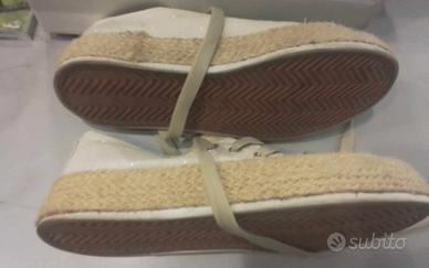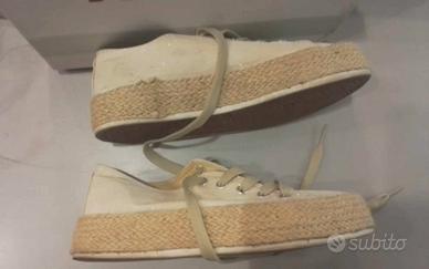 Numero 37, in tela color beige, con piccoli brillantini che danno punti di luce, suola in gomma bordata in corda.