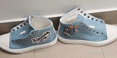 Fodera in tela di cotone azzurro, suola in gomma bianca.