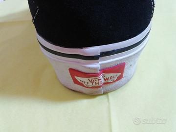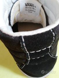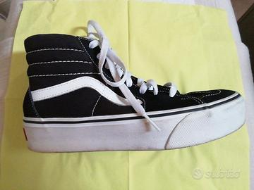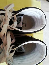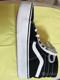 Vendo scarpe sneakers uomo tg. 38, marca americana Vans, color nero. Tomaia alta in tela in alcune parti, e poi in altre in similpelle scamosciata. L'interno in pelle bianca, tallone imbottito per maggior comfort e supporto, punte rinforzate e suole in gomma a nido d'ape, per una migliore sensazione sul terreno.
