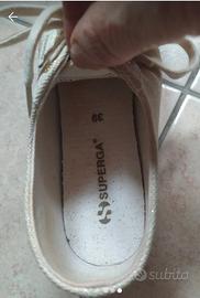 propongo scarpe sportive donna marca Superga numero 39 colore beige brillantinato in cotone pesante rigido. ottime da indossare in primavera estate. lo stato di queste scarpe è ottimo perché usate pochissimo.