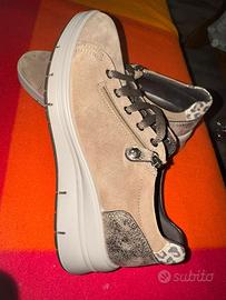 Scarpe sportive eleganti e comode. - Tomaia in camoscio - Dettagli animalier sul tallone - Zip laterale - Lacci marroni - Suola bianca