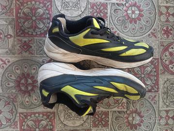 Vendo scarpe da ginnastica FILA nere con dettagli lime fluo e suola bianca.