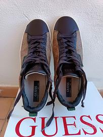 Suola gomma, tomaia con motivo guess, logo laterale, chiusura lacci color marrone, suoletta in pelle.