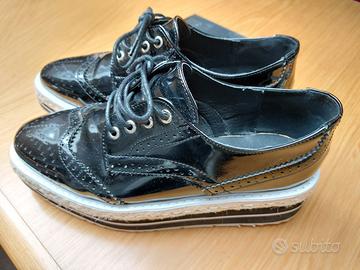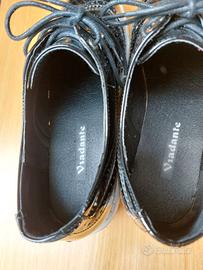 Scarpe donna casual in vernice nera e chiusura laccetti coordinati.