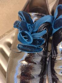 Scarpe stile francesine in vernice nera e lacci in velluto blu Cina. Suola in gomma.