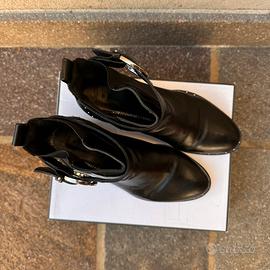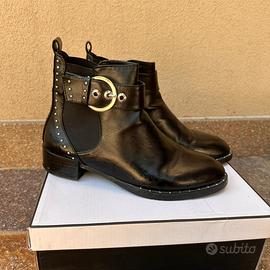 Stivaletti neri in eco pelle, impermeabili, trendy, adatti sia a vestiti che pantaloni. Usati poco, stato discreto – 3,5/5.