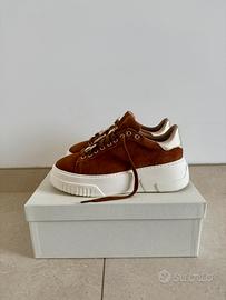 Scarpe da ginnastica eleganti marrone scamosciato e gomma bianca, charm sui lacci di entrambe le scarpe MAI USATE. Made in Italy