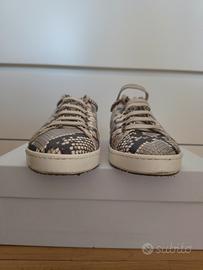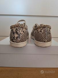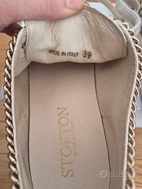 Scarpe stringate Stokton in ottimo stato, usate poco. Effetto pitone nei toni di beige e nero, con catenella dorata. Sono un 39 ma vestono grande, io normalmente porto il 40. Lunghezza plantare: 26,5 cm. Tomaia e plantare in pelle. Made in Italy. Prezzo in negozio: 178€