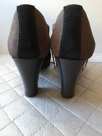 Vendo scarpe inglesine Tata, in camoscio, stringate, da donna, numero 39, con tacco cm 8, colore nero e grigio. Usate pochissimo, non presentano segni di usura, igienizzate. Vendo nella loro confezione originale.