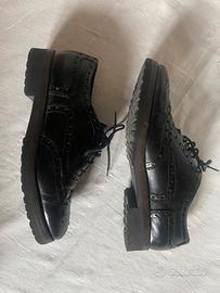 scarpe modello francesina, suola robusta in gomma, cuoio lucido, colore nero, lavorazione artigianale