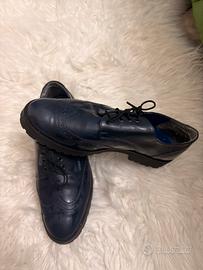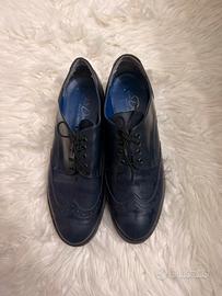 Scarpe stringate color blu in stile classico, con dettagli traforati sulla punta. Comode e pratiche, adatte sia a look casual che più eleganti. Perfette per l’uso quotidiano o per l’ufficio, facili da abbinare a pantaloni o gonne.