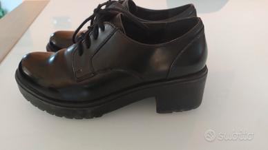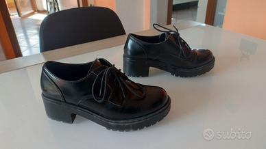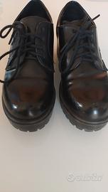 Vendo bellissime scarpe stringate in ecopelle nera lucida. Suola "carro armato" alta e robusta, perfetta per chi cerca un look deciso senza rinunciare alla comodità. Colore: Nero intenso. Stile: Derby platform / Goth / Urban. Stato: Usate ma in ottime condizioni Taglia: 37