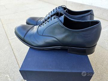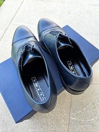 Scarpa stringata blu scuro realizzata in morbido cuoio liscio di vitellino. 100% Made in Italy fatta a mano, si tratta di una scarpa di altissima qualità, per cerimonia o business, con chiusura mediante lacci in tinta. Tacco basso 2.5 cm che favorisce la calzata. Usura come da foto, vengono vendute in scatola originale, igienizzate.