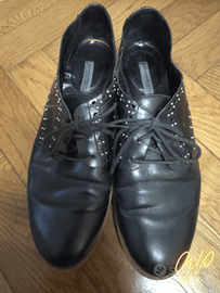Dettagli: traforature/brogue + micro-borchie, suola bicolore
