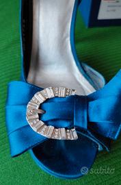 Splendide scarpe n. 38 tacco alto in raso blu Midnight Satin con fibbia gioiello.