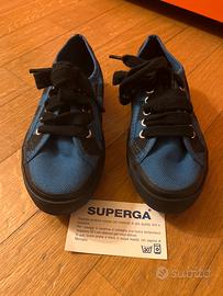 Scarpe Superga originali da bambino o bambina, mai usate, con scatola originale, misura 32. Scarpe da ginnastica in tela Superga color azzurro e nero (che richiamano la squadra dell’Inter). in ottimo stato, suola integra.