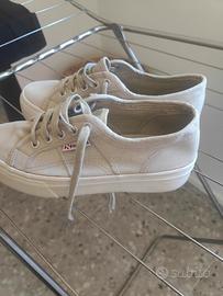 Scarpe di tela beige Superga, con zeppa color panna di 3cm, con stringhe e suola di gomma, qualche difetto come da foto ma ottimo stato, usate solo un paio di volte, numero 38
