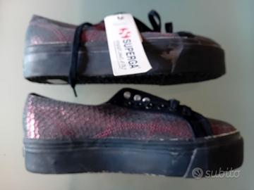 Scarpe Superga numero 39, modello insolito con zeppa scura e tessuto bordeaux stampato tipo serpente. Mai indossate, come si vede dalle suole e dal cartellino del marchio ancora attaccato. Non ho più la scatola