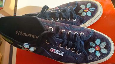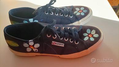 Scarpe Superga con fantasia primaverile, sfondo blu e dettagli colorati.