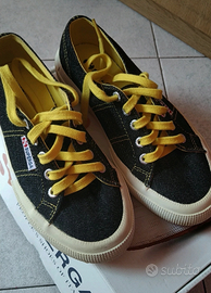 Superga di jeans con stringhe e cuciture gialle. Usate una sola volta. Nuove e nella confezione originale. Numero 36