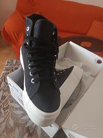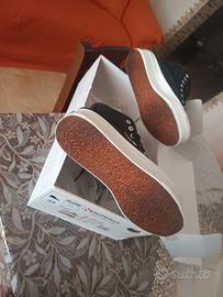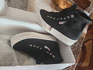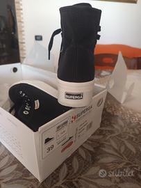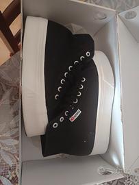Vendo scarpe Superga originali, nera in tela, con suola alta bianca numero 39, modello classico e versatile, adatte a ogni occasione, indossate solamente due volte, sono pulite, senza difetti né segni di usura, pari al nuovo perfette per chi cerca comodità festina ha un prezzo conveniente