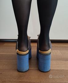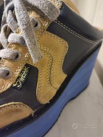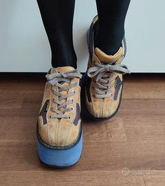 Sneakers vintage con plateau Swear London, anni '90, n. 37. Zeppa azzurro- viola altezza 10 cm, tomaia in pelle gialla con inserti marroni e lacci grigi. Collezione storica linea "Truck".