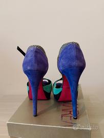 Colori nero, Tiffany e viola, con suola rossa, e inserto con fantasia pied de poule.