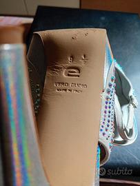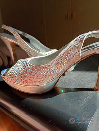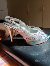 Scarpe da donna color argento, tacco 8 cm l, con plateau. Chiusura con cinturino regolabile. indossate una sola volta, pari a nuove. Numero 38.