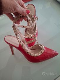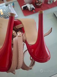 scarpe tacco alto rosso vernice con borchie dorate e laccetto alla caviglia numero 38