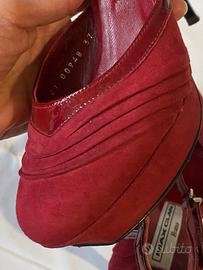 Scarpe Max Clan Roma, in pelle scamosciata con cinturino e bordi in vernice, e tacco laccato nero. Le scarpe hanno il plateau e risultano molto comode, e stabili, grazie al cinturino che si allaccia alla caviglia. Tacco 10 cm, plateau 2 cm. Indossate solo ad una cerimonia, non presentano segni sulla pelle o punti rovinati.