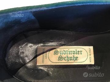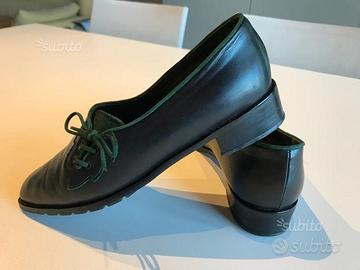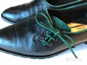 Scarpe tirolesi della Sudtirolet Shine, n. 40 in vera pelle nera morbidissima e finiture in Lella scamosciata verde bosco. Laccetti laterali. Suola a piccolocarrarmato. Tacco in gomma per non fare rumore nel camminare. Pagate oltre 100?