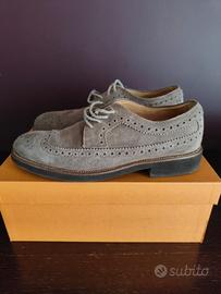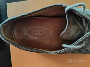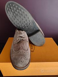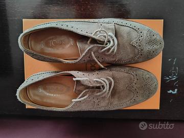Vendo scarpe usate Tod's uomo in foto,in ottime condizioni,taglia 9 inglese corrisponde a 43 Italiana,stringate in pelle scamosciata con bucature all'inglese a coda di rondine, colore grigio/tortora,monogramma impresso, suola in gomma,tomaia in pelle, scatola originale..in abbinamento regalo cintura artigianale in cuoio identico colore delle scarpe..