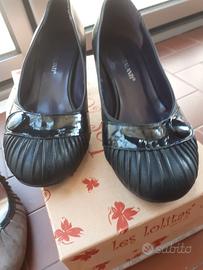 scarpe nere quasi nuove, tacco cm 5 in pelle ed inserti vernici, pianta larga