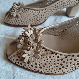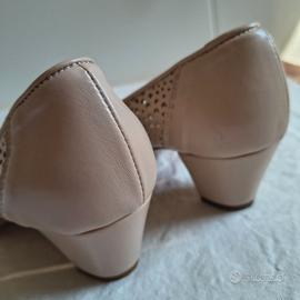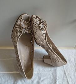 scarpa estiva colore beige traforata in pelle, marca Miss Clair. Taglia 38 e mezzo. Tacco 5 cm. Indossata alcune volte ed in ottimo stato.