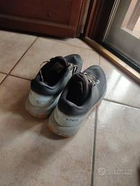 Scarpe resistenti e comode per running su sentieri in ghiaia e sterrati. Confortevoli anche per passeggiate su asfalto e sentieri di montagna. Usate poco ma condizione come nuovo, cambiate con un modello più recente. Suola integra, lacci integri, maschera proteggi dita integra. Drop 8 mm. Colore scarpa grigio/nero, suola arancione e grigia. Numero 45.