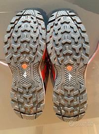 Scarpe da Trekking in buone condizioni color rosso e nero n° 41 con piccolo difetto come mostrato nell'ultima foto.