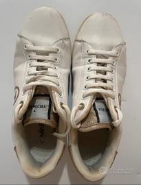 Colore bianco con dettagli in oro glitterato sul tallone e sulla linguetta, logo Trussardi ben visibile sul lato.