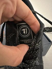 Dettagli curati, logo Trussardi tono su tono e suola con finitura scintillante, per uno stile raffinato ma discreto.