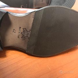 Scarpe modaiole uomo artigianali mai usate con applicata la suola ed il tacco in gomma dopo l’acquisto. Misura 42-marrone lucido.Pregevole fattura.