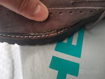 scarpe uomo taglia 44 marroni, sono perfette e poco usate,come si vede dalle suole. Presentano un unico difetto nella scarpa sinistra ben evidenziato dall'ultima foto della sequenza. Il difetto, poco visibile se non ingrandito, non pregiudica l'estetica e l'utilizzo della scarpa